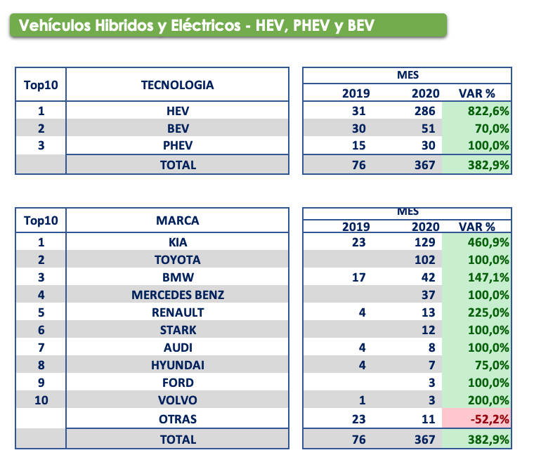 El grupo de vehículos Híbridos y Eléctricos inicia este año con 367 unidades registradas y una variación del 387% frente al mismo mes de 2019, este grupo lo lidera Kia, seguida por Toyota con su nuevo Corolla Hybrid.