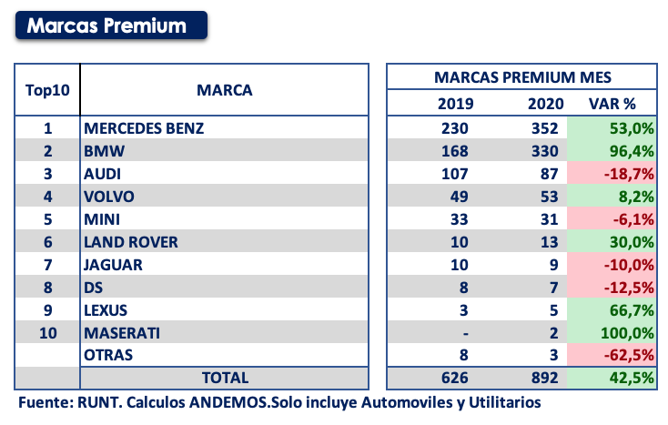 El grupo de marcas Premium inició en Colombia con el acelerador a fondo en enero, alcanzando las 892 unidades y una variación de 42.5%, grupo que continúa siendo liderado por Mercedes Benz con 352 unidades y seguida por BMW con 330 unidades.