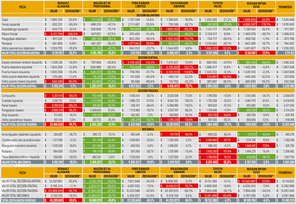El segmento objeto de estudio corresponde a vehículos pick up 4×4 diésel transmisión automática con valor mayor a $120.000.000. Los precios aquí relacionados corresponden a repuestos originales, cotizados en concesionarios o puntos autorizados por la marca para Colombia, son valores sin descuentos y sin IVA, actualizados a 30 de abril de 2018.